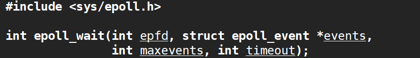 等待事件的接口是epoll_wait,第一个参数传入epoll自己的文件描述符,第二个参数events是输出型参数,需要用户创建数组并传入,epoll_wait会在events内填写已就绪的文件描述符,maxevents用于表示数组的大小,它决定了一次最多能返回多少事件。