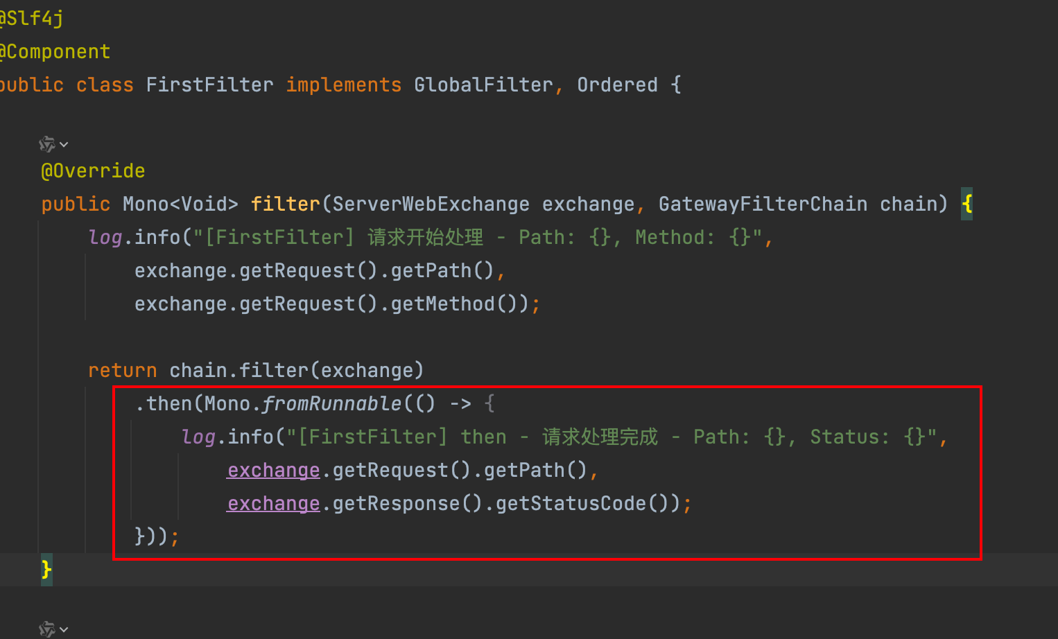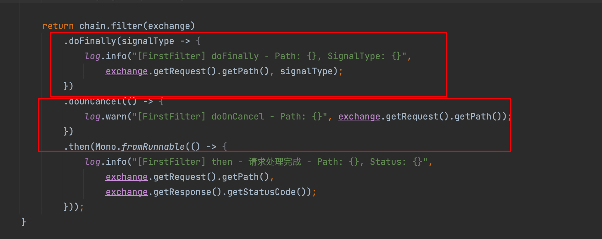 而根据SpringCloudGateway的底层逻辑,调用方请求超时,请求链路会收到一个cancel指令,会导致后续的Filter的then()不会往后执行,而我的日志记录操作正是放在Filter的then()中;