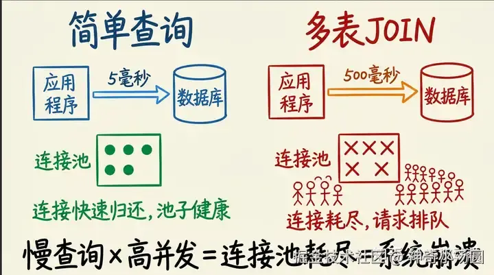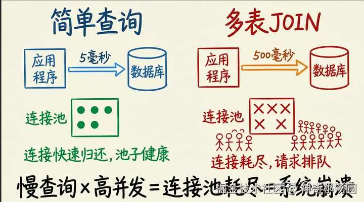 一张图就能看明白:左边的简单查询5ms归还连接,池子永远健康。右边的多表JOIN占住连接500ms,高并发一来,池子瞬间被打满,后续请求全部排队。