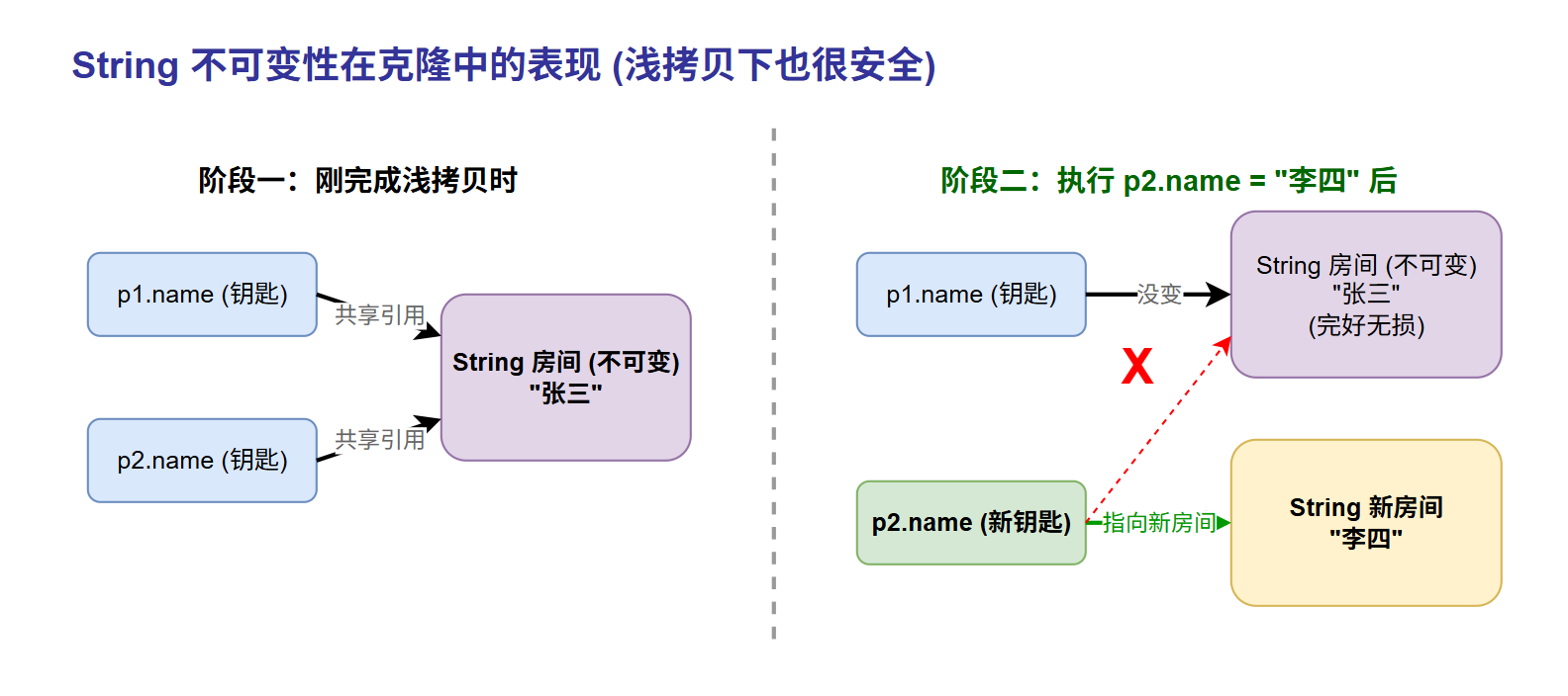 int):直接复制具体的值,互不影响。 - 引用数据类型 (如对象、数组):只复制"钥匙"(内存地址),不复制"房间"(对象本身)。原对象和克隆对象共用同一个内部子对象。修改一方内部的引用类型属性,另一方也会连带改变。