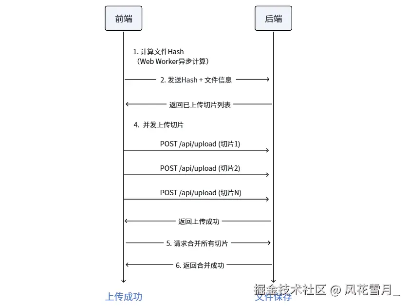 关键:后端需保存每个文件的切片上传记录,如按 Hash 值创建文件夹,存储已接收的切片,确保刷新页面、断网后,能恢复上传进度。
