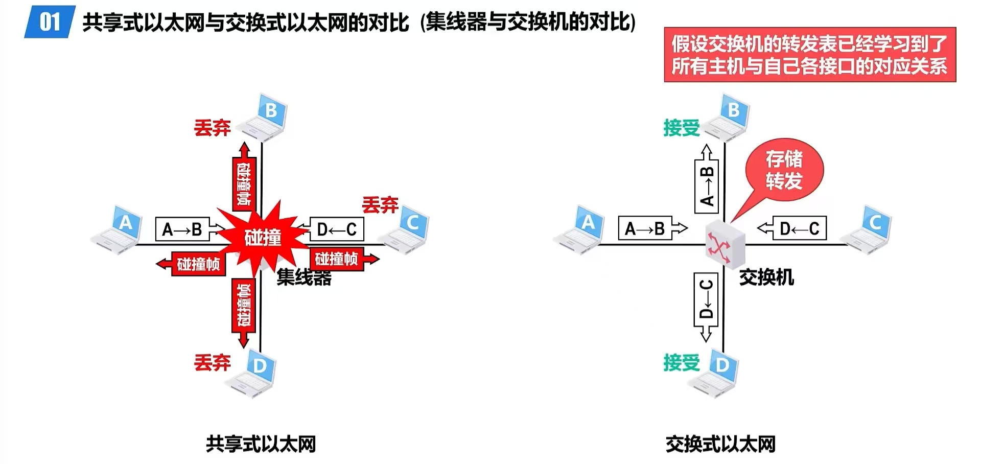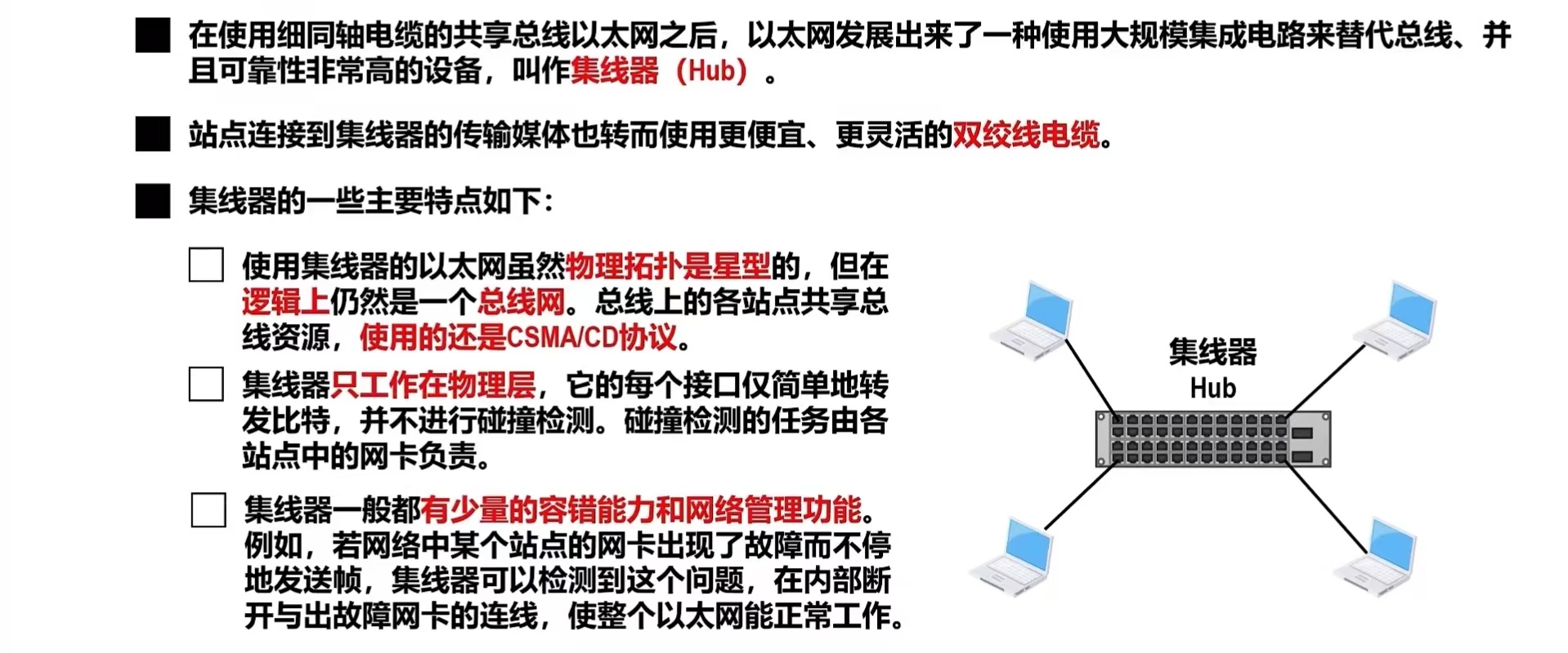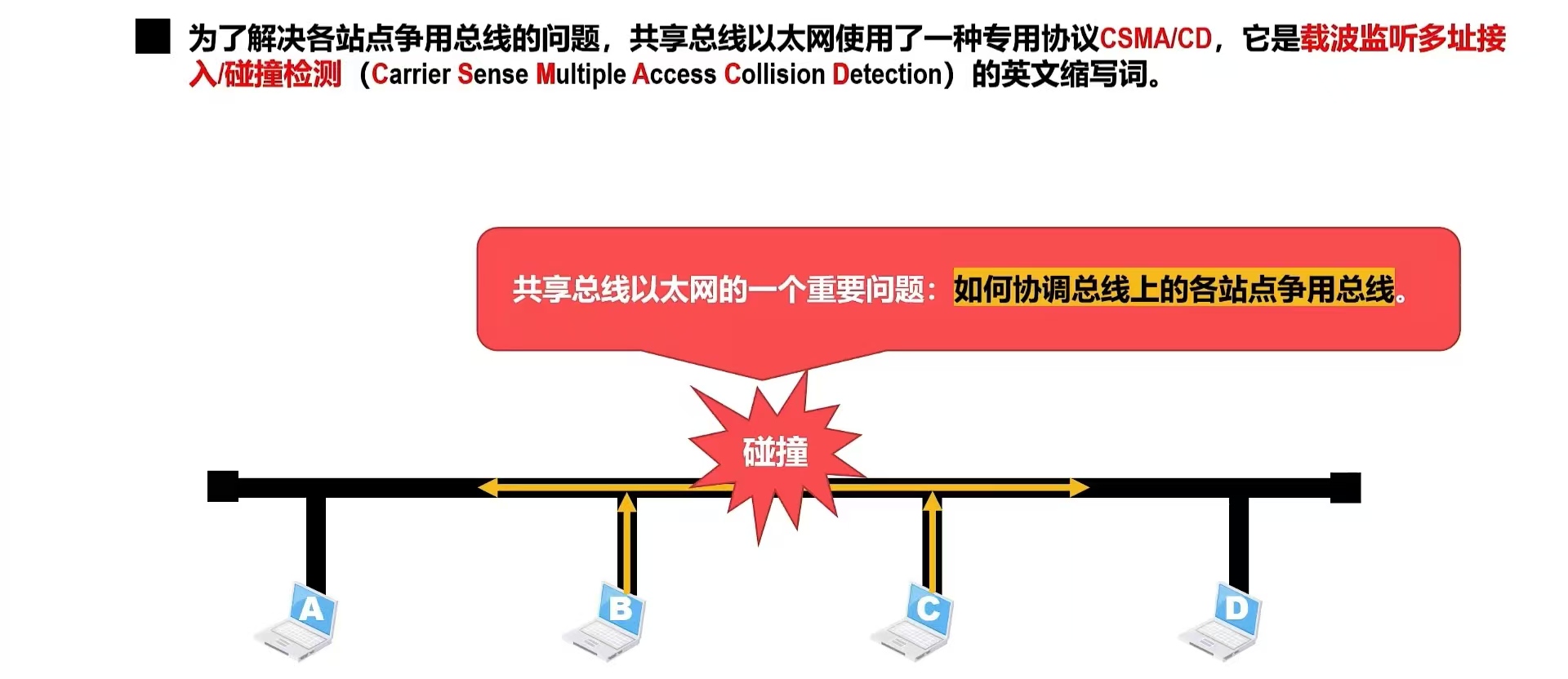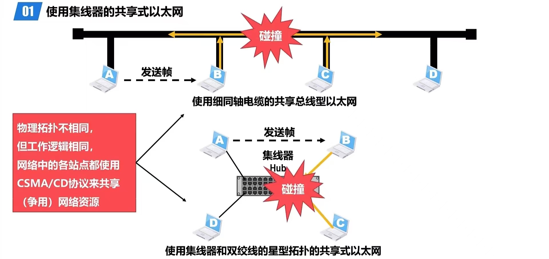 共享式以太网概念:共享式以太网是早期采用总线型或集线器(HUB)结构、所有站点共享同一传输介质和总带宽的以太网,核心是共享信道、竞争发送。