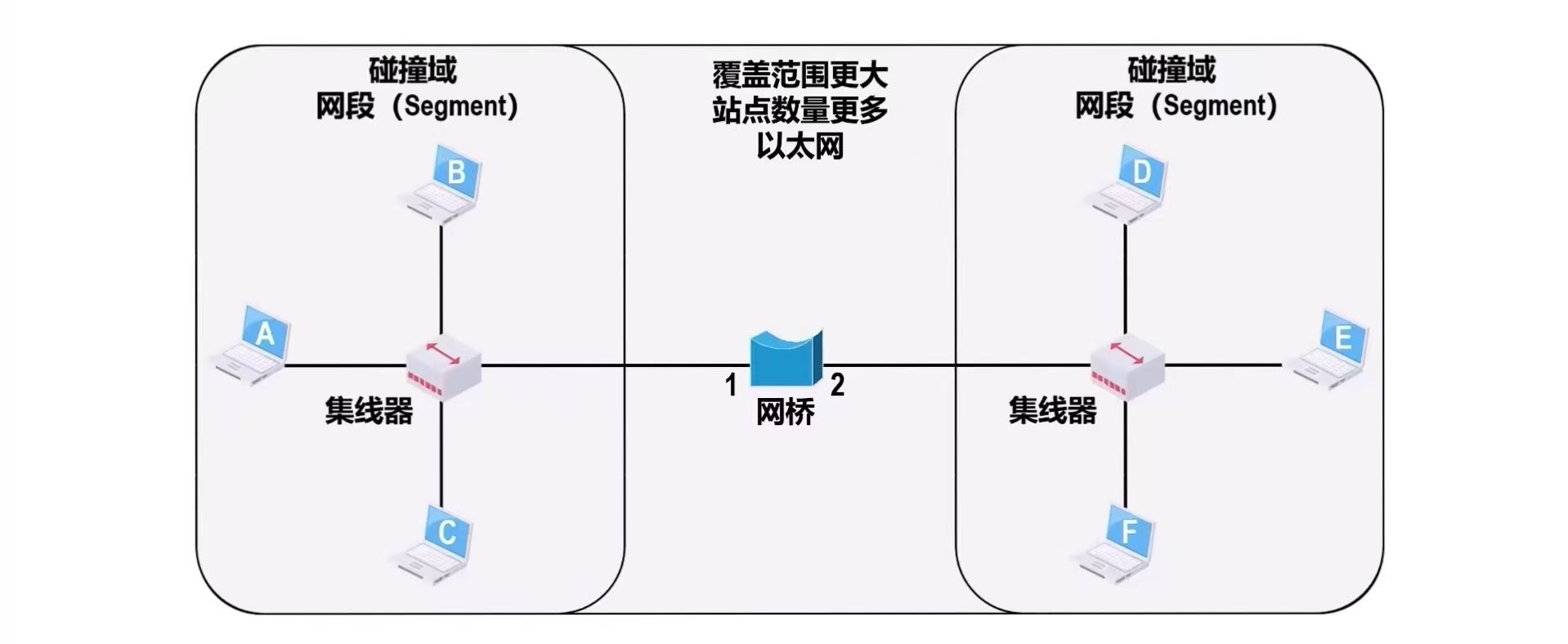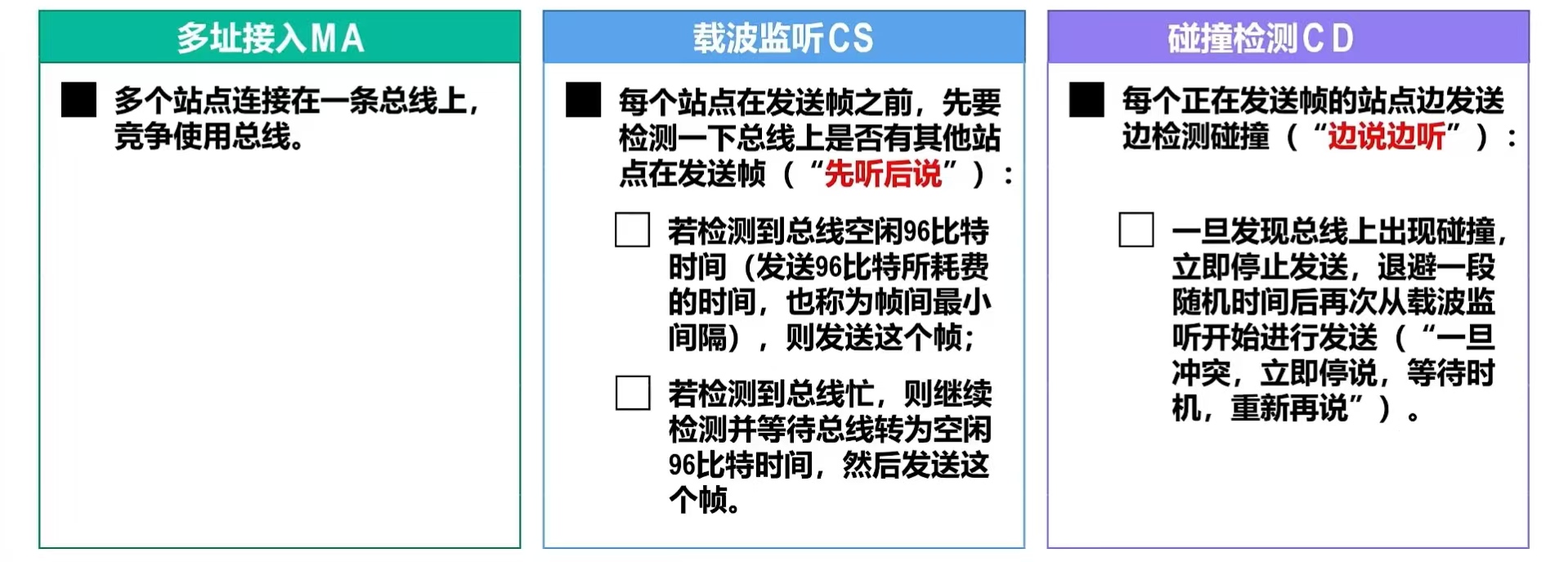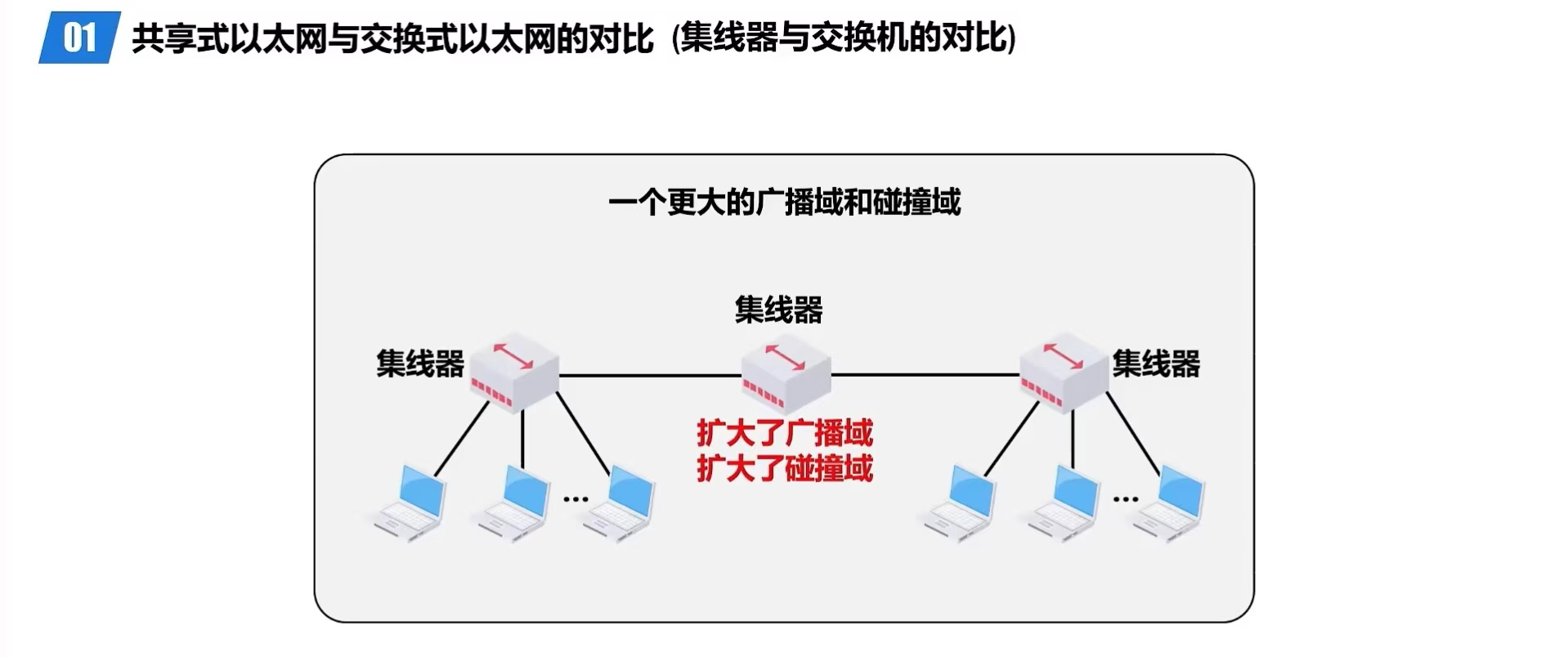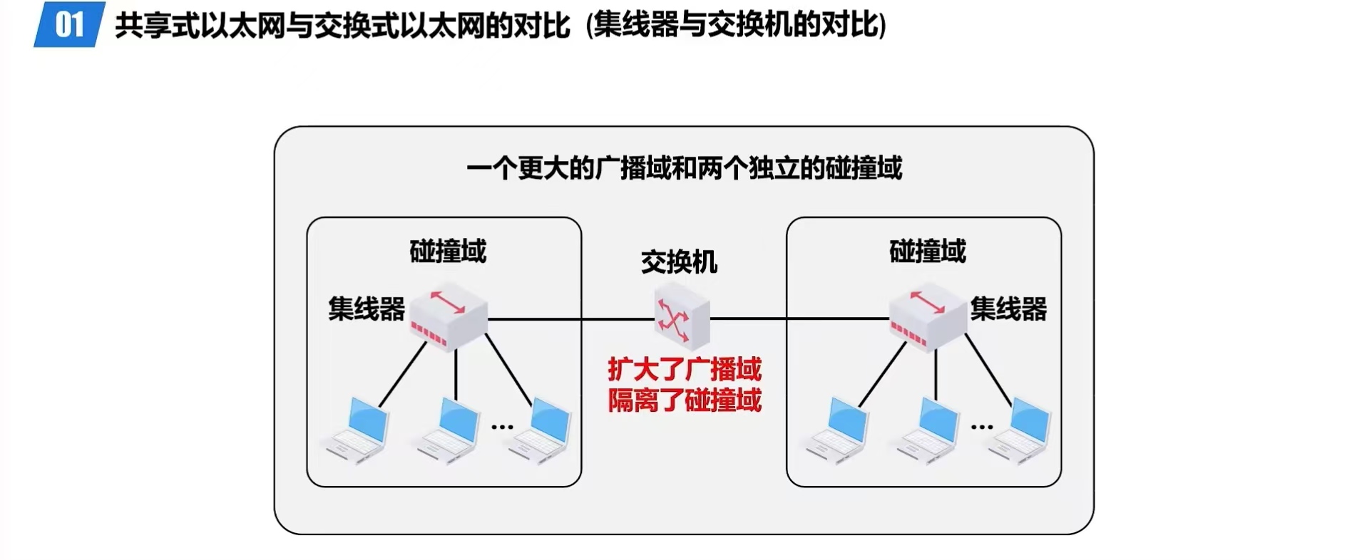 共享式以太网概念:共享式以太网是早期采用总线型或集线器(HUB)结构、所有站点共享同一传输介质和总带宽的以太网,核心是共享信道、竞争发送。