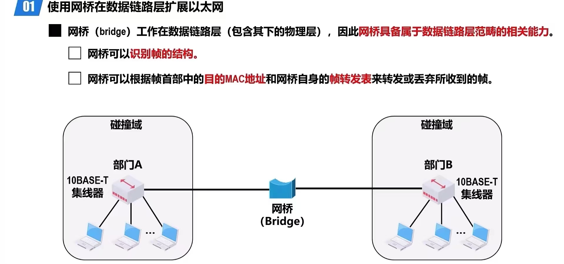 - 交换机:数据链路层设备,独享带宽,每个端口独立冲突域