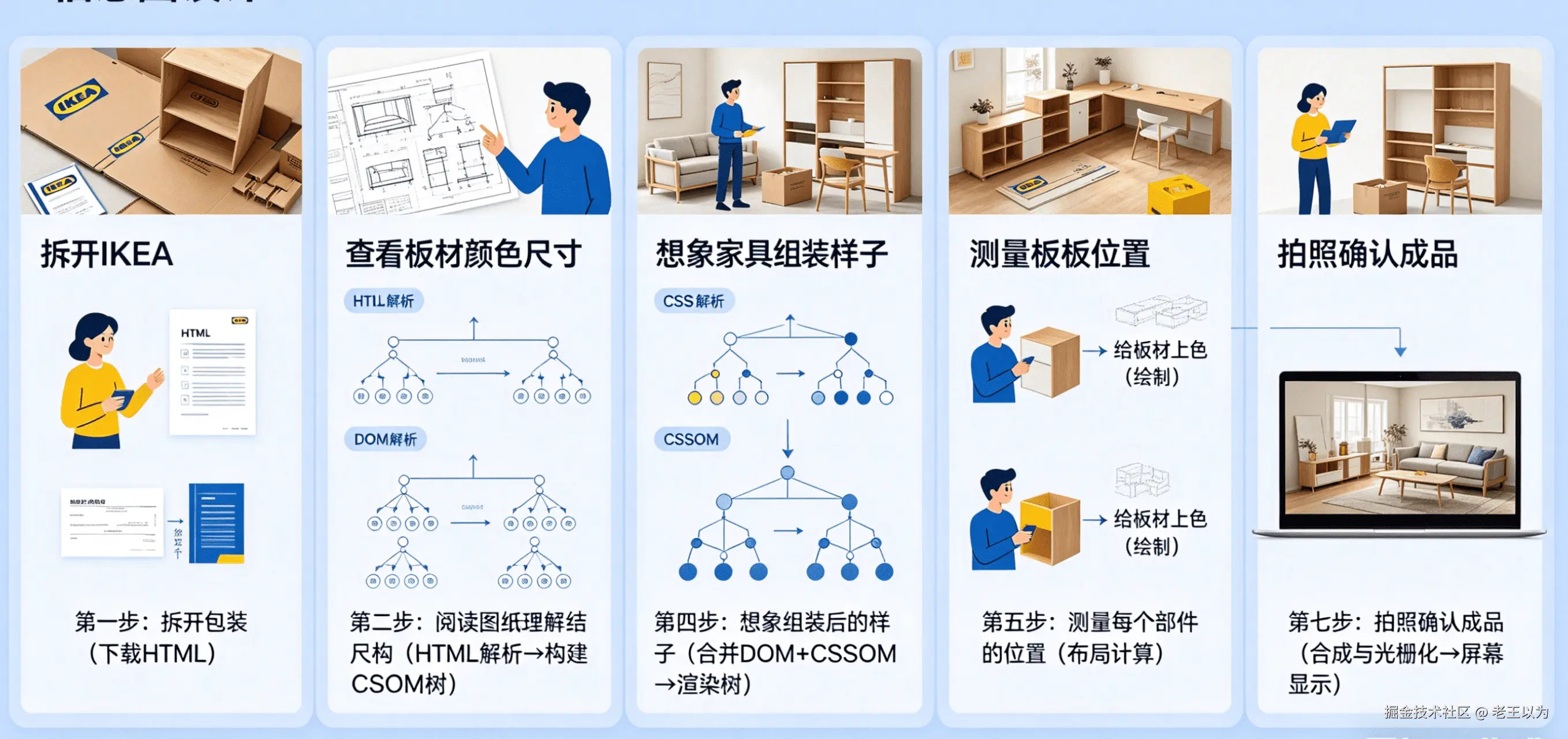 想象我们在组装一件宜家家具。 你收到的是一个扁平的包装箱(HTTP 响应),里面装着图纸(HTML)、螺丝钉和板材(CSS、JavaScript),以及组装说明书(浏览器的渲染引擎)。你的工作流程大致如下: