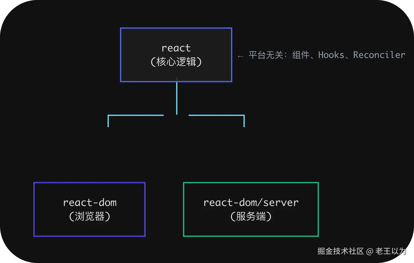 react包只负责组件定义和状态管理,完全不依赖任何平台 APIreact-dom负责将虚拟 DOM"画"到浏览器的真实 DOM 上react-dom/server负责将虚拟 DOM 转化为 HTML 字符串