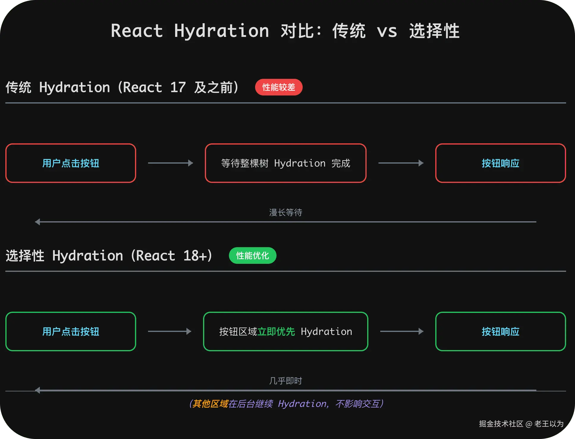 面对这些挑战,React 和 Vue 采用了不同的"生存策略":