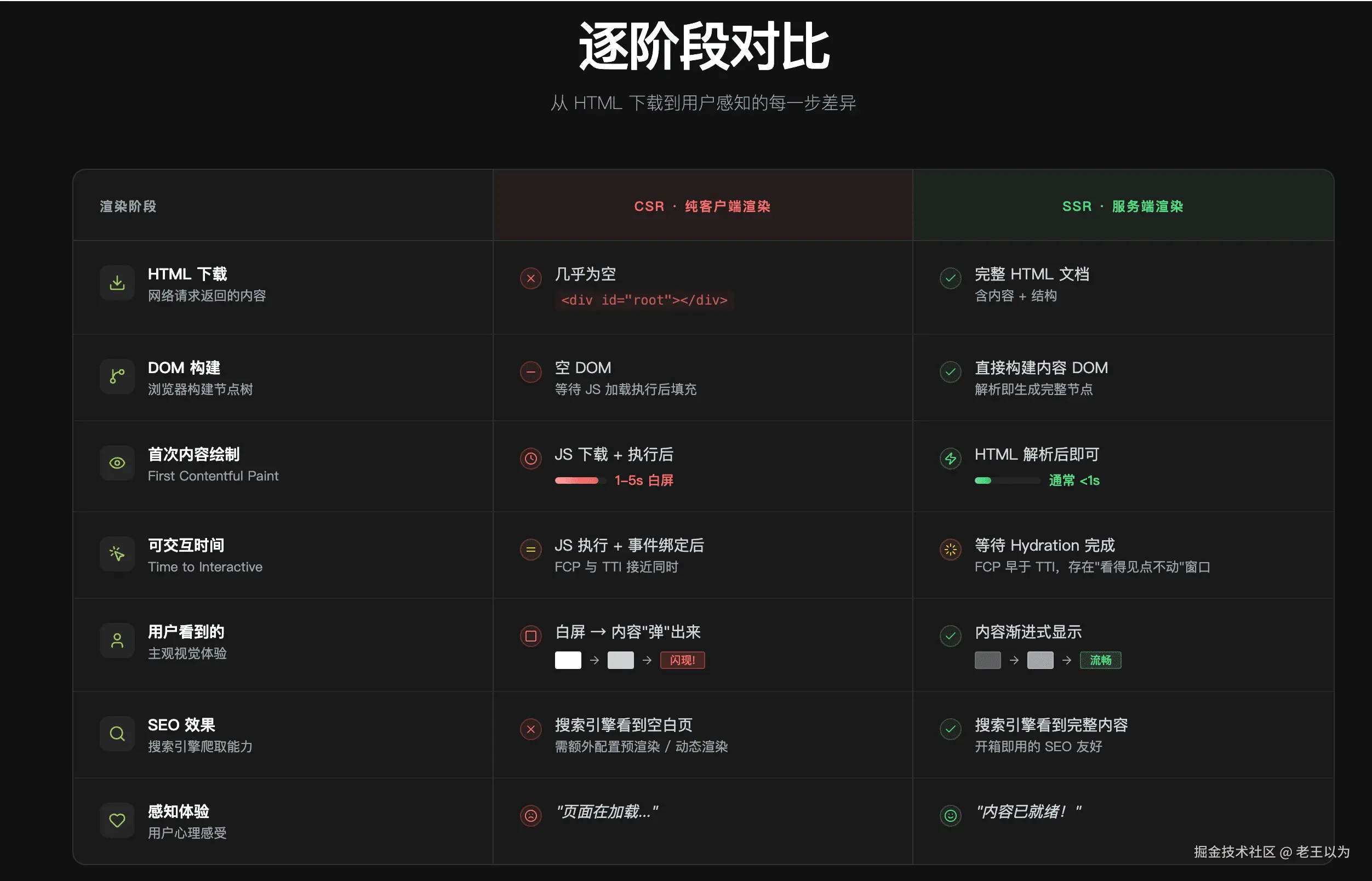 | 指标 | 模板引擎时代 | SPA / CSR | 同构 SSR | 现代 SSR |