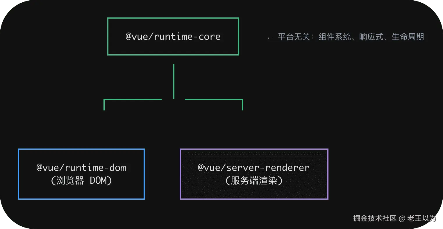 @vue/runtime-core提供平台无关的运行时@vue/runtime-dom处理浏览器 DOM 操作@vue/server-renderer将虚拟 DOM 转化为 HTML 字符串