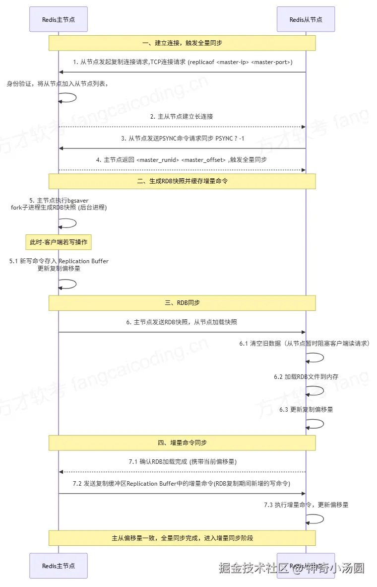 全量同步是从节点获取主节点完整数据的过程,适用于从节点首次连接主节点 或从节点断线后无法进行增量同步(如主节点运行 ID 变化、偏移量超出复制缓冲区范围) 的场景。流程可拆解为7步,核心是通过PSYNC与FULLRESYNC协商同步方式,再通过 RDB 快照 + 增量命令补发完成数据一致性校验: