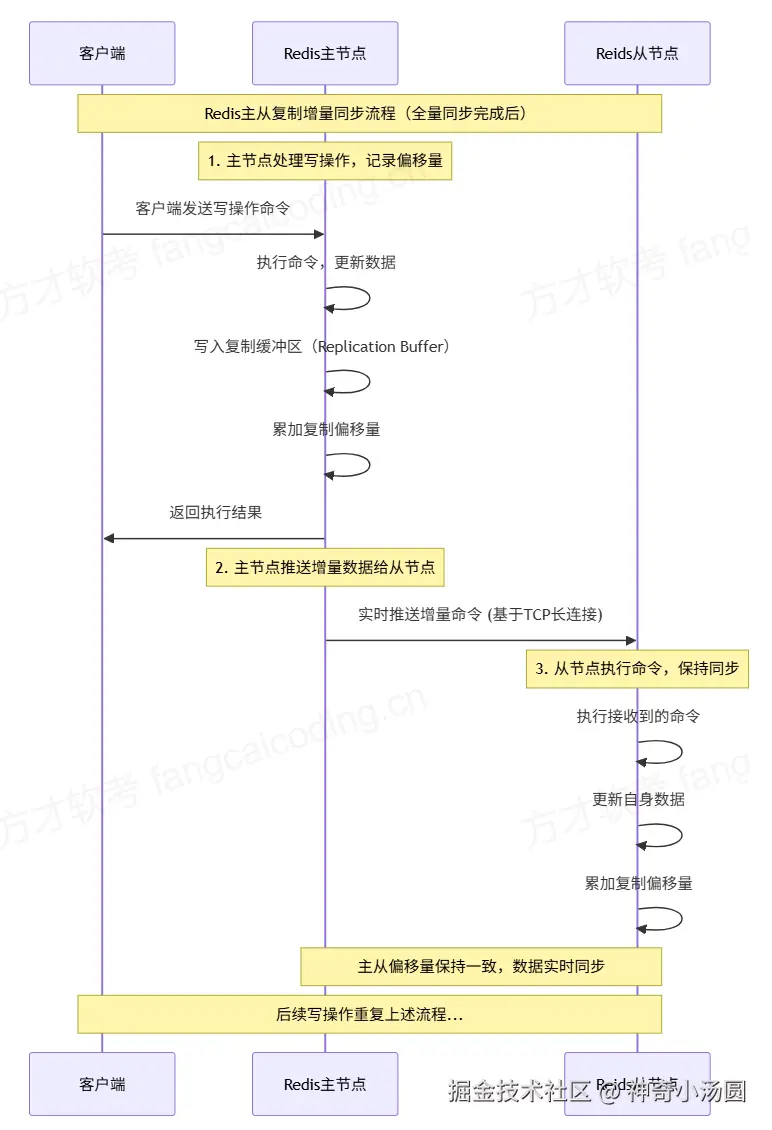 当主从节点的复制偏移量完全一致时,全量同步完成 ,主从复制进入稳定的"增量同步阶段"------ 此后主节点的写命令会通过命令传播机制实时同步给从节点。