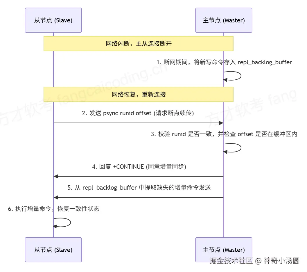 •若 Run ID 不变(仍为原主节点)且偏移量在复制积压缓冲区内 :触发增量同步,主节点直接将缓冲区内偏移量之后的命令发送给从节点,快速恢复同步。