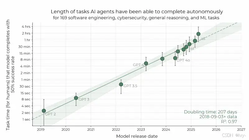 每7个月,大模型能够以50%成功率完成的任务,时间范围扩大一倍。按照这个趋势,大模型将在2027年至2031年间,以50%的成功率完成人类专家需要一个月才能完成的任务。