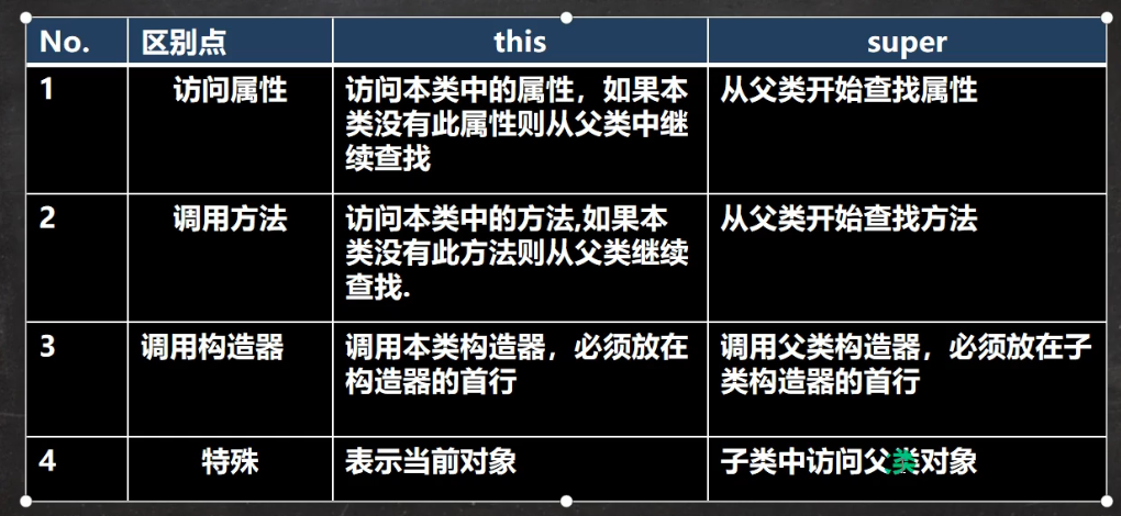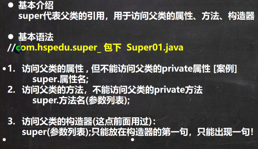 (2)当子类中有和父类中的成员(属性和方法)重名时,为了访问父类的成员,必须通过super。如果没有重名,使用super、this、直接访问是一样的效果!