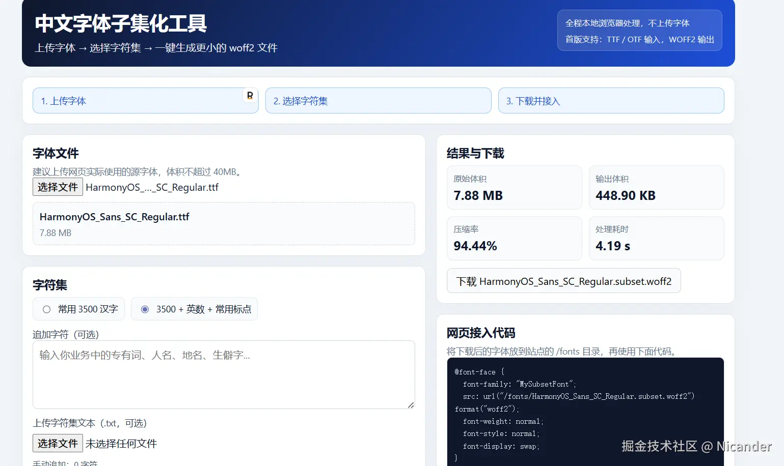 一个基于浏览器本地运行的字体子集化工具:上传字体文件,选择字符集,生成更小的
