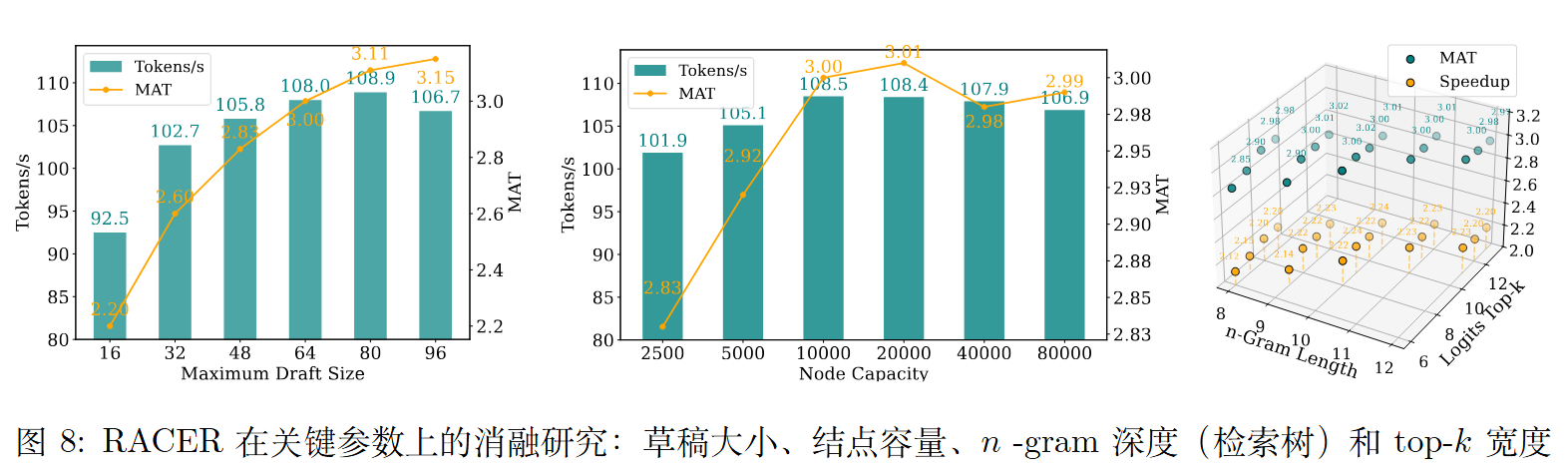 在不同采样温度(greedy, T=0.5, T=1.0)下,RACER 的加速比几乎不变。这意味着在实际部署中不需要为不同的解码策略重新调参。
