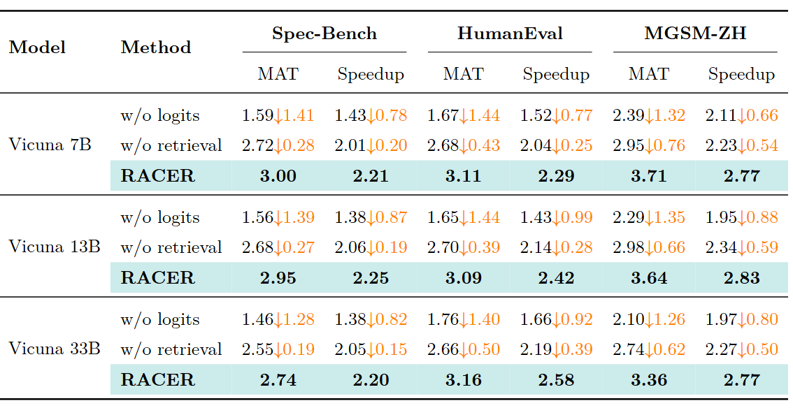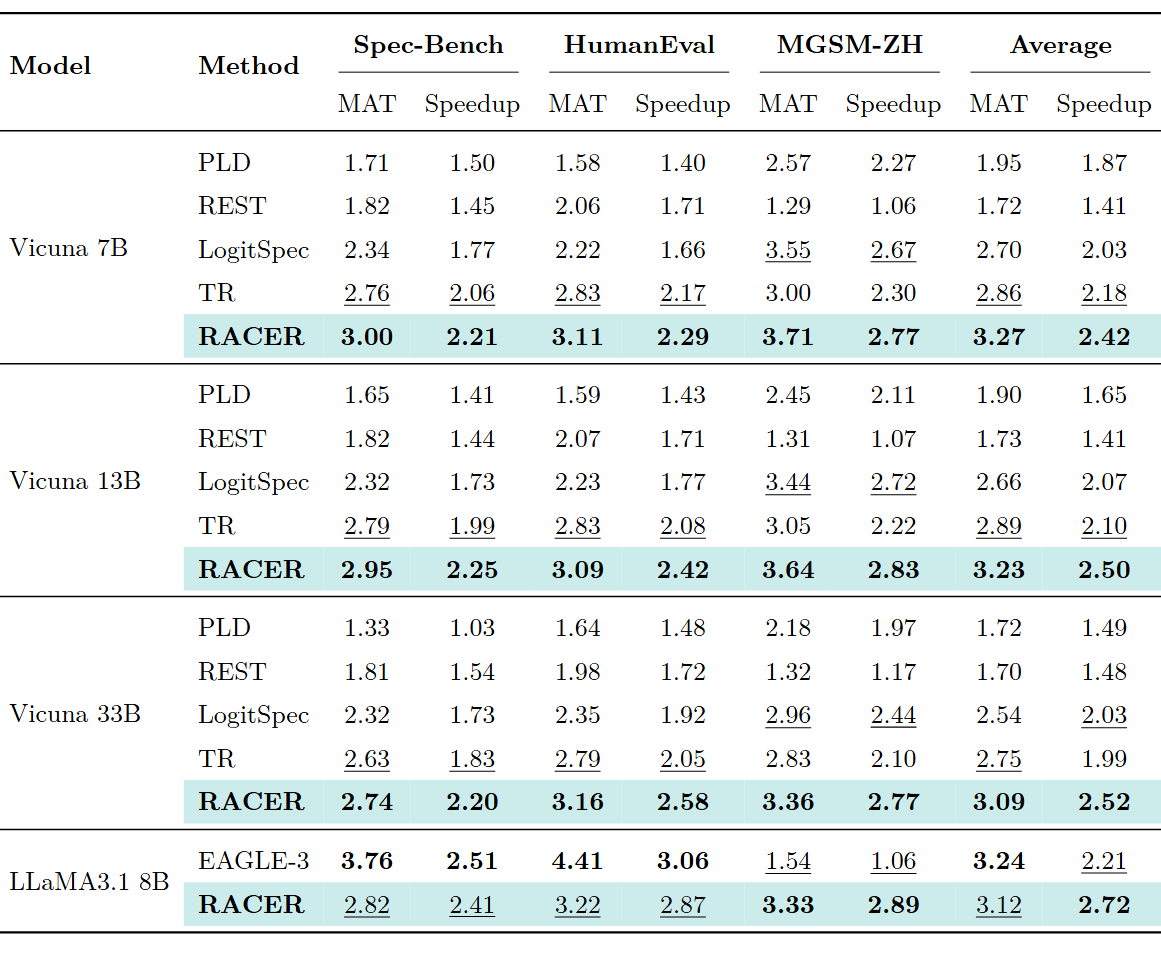 在 Vicuna 系列(7B/13B/33B)上,RACER 全面超越 PLD、REST、Token Recycling、LogitSpec: