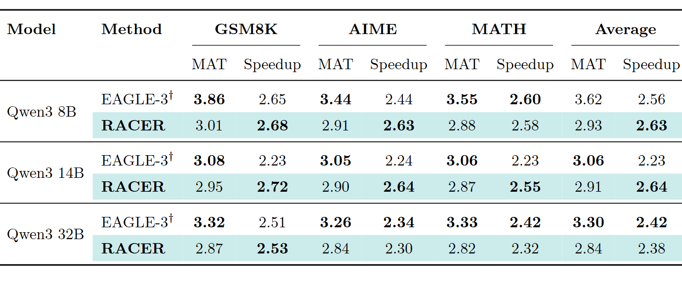 EAGLE-3 是当前最强的 model-based 方法,需要额外训练草稿模型。虽然 EAGLE-3 在 MAT 上通常更高(毕竟有专门训练的模型),但 RACER 在端到端加速比上经常更优: