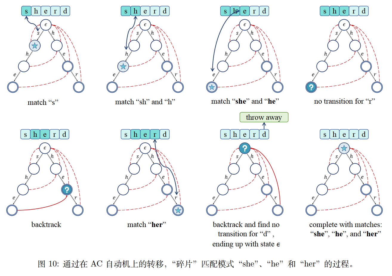 - 收集所有匹配位置(包括通过失配链接找到的短匹配)的后续子树