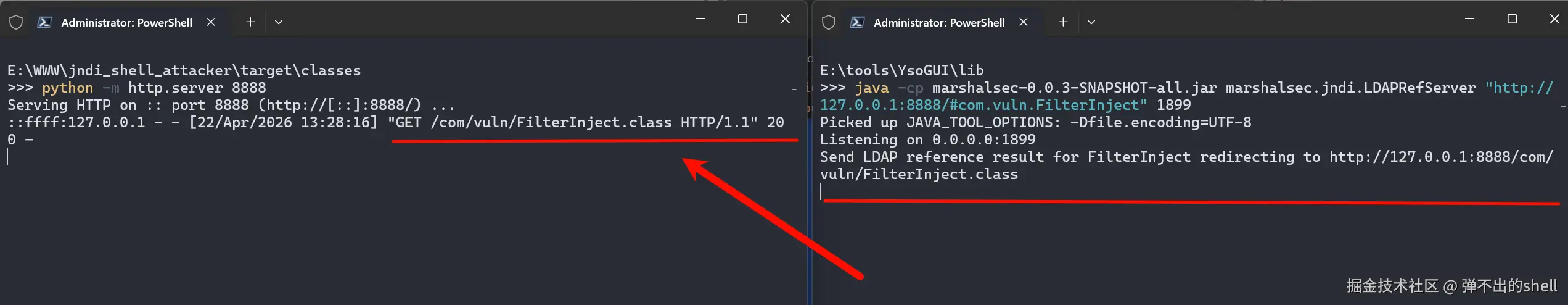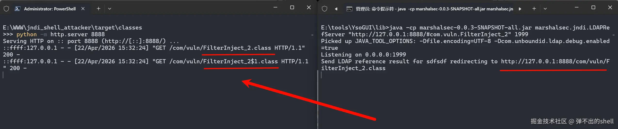 LDAP服务返回Reference,被攻击服务器向Python HTTP服务请求 FilterInject.class,Python服务日志确认类文件被成功获取(左边是python右边是marshalsec):