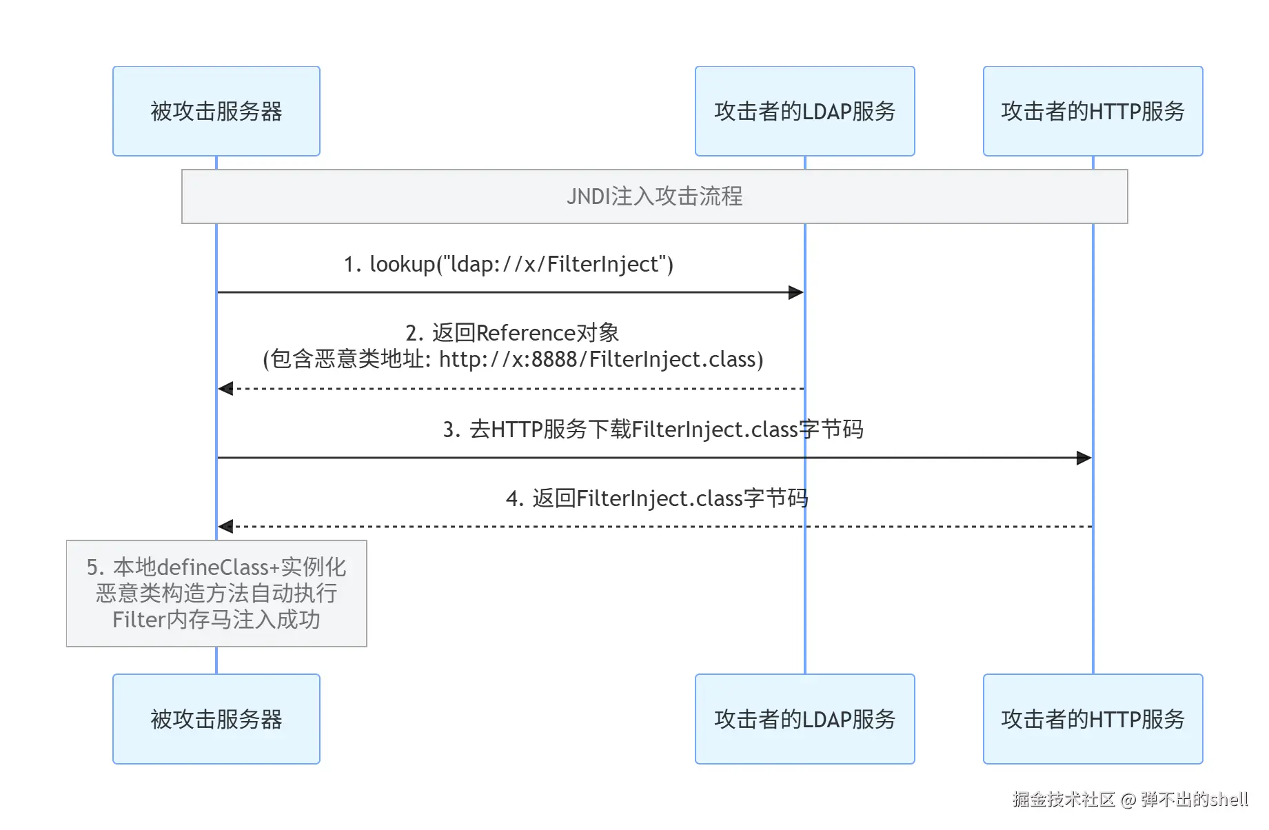 被攻击服务器、攻击者的LDAP服务、攻击者的HTTP服务,三者之间的完整三角关系如下: