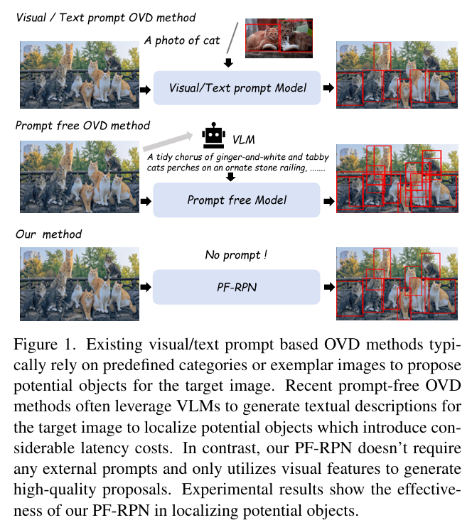 开放词汇物体检测(Open-Vocabulary Object Detection, OVD)模型 [6, 8, 11, 13, 17, 32, 42] 通过利用类别名称或示例图像作为提示,在定位未见域物体方面展现了令人印象深刻的能力。尽管 OVD 方法因其强大的泛化能力而适合作为 RPN 检测器,但它们对预定义类别和示例图像的依赖限制了实际场景中的灵活性。例如,在工业缺陷检测和水下物体检测场景中,目标类别和示例图像通常不可用,这大大限制了这些模型的应用。尽管一些无需提示的 OVD 模型 [22, 29, 45, 52] 探索使用生成式视觉-语言模型(VLMs)来消除手动提供提示的需求,但它们往往会引入显著的内存和延迟成本。因此,有必要提出一种高效的区域提议网络,能够在无需外部提示的情况下跨各种领域泛化。