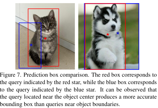 中心性引导的查询选择。CG-QS 的核心思想是,靠近物体中心的图像查询往往比靠近物体边界的查询生成更准确的提议。如图 7 所示,当模型选择中心区域查询(红色星号)时,它产生精确的边界框。相比之下,当模块从边界区域选择查询时,通常会导致显著的定位误差。基于这一观察,我们引入中心损失以鼓励模型优先考虑更靠近物体中心的查询。为评估 CG-QS 策略的有效性,我们可视化了选定的图像查询,如图 5 所示。添加 CG-QS 模块后,我们的模型更倾向于选择中心位置的查询,证实了 CG-QS 策略的有效性。