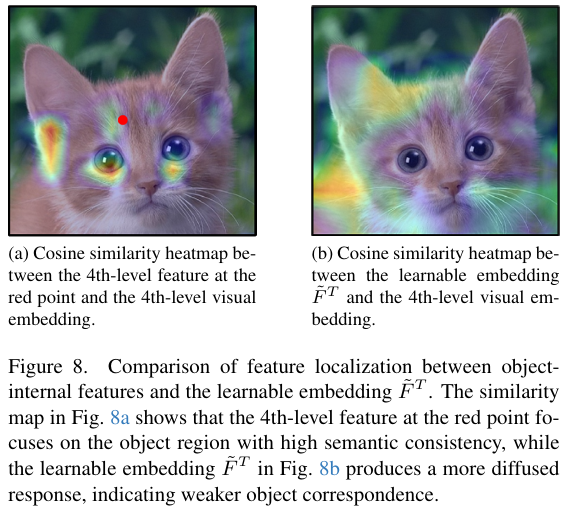 如图 8 所示,图 8a 中的物体内部特征以高语义一致性聚焦于物体区域,而图 8b 中的可学习嵌入产生更分散的响应。