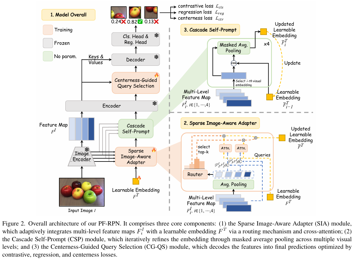 图 2 展示了 PF-RPN 的整体架构。首先,图像编码器(如 ResNet [14] 或 Swin Transformer [28])提取多级特征图 FIi∈RHi×Wi×C,i∈{1,...,4}F_I^i \in \mathbb{R}^{H_i \times W_i \times C}, i \in \{1, \dots, 4\}FIi∈RHi×Wi×C,i∈{1,...,4},其中 Hi×WiH_i \times W_iHi×Wi 表示第 iii 个特征图的空间分辨率,CCC 为通道维度。然后,稀疏图像感知适配器 (SIA)通过路由机制和交叉注意力自适应地将 kkk 个最信息丰富的特征与可学习嵌入 FT∈R1×CF_T \in \mathbb{R}^{1 \times C}FT∈R1×C 集成。随后,级联自提示 (CSP)模块使用从深层到浅层的特征图逐步优化 FTF_TFT。最后,多级特征 FIiF_I^iFIi 被展平为 FI∈RH×W×CF_I \in \mathbb{R}^{H \times W \times C}FI∈RH×W×C 并用作记忆,遵循 DETR 类框架 [4, 27, 57, 63]。我们将 Grounding DINO [27] 中的语言引导查询选择替换为我们的中心性引导的查询选择(CG-QS)模块以解码物体提议。整个框架在带有伪边界框的分类数据集和物体检测数据集上联合训练。