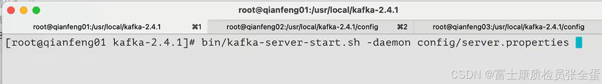 先去启动zk集群,再去启动kafka,kafka启动加上daemon,改为后台启动。同理其他节点依次启动。