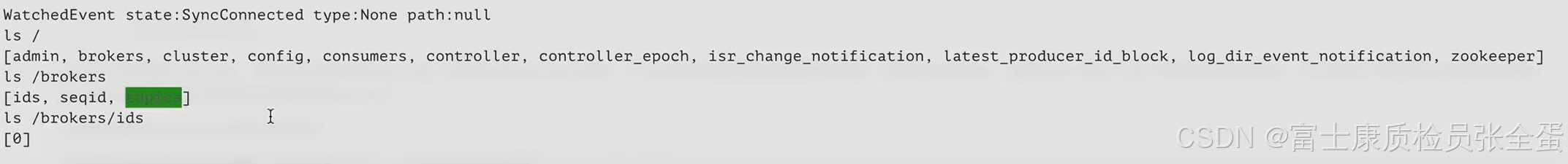 比如在broker目录下的ids节点里面存放的是所有活跃的broker节点。因为是单机版本的,只有一个broker角色,所以这里面只有0号的。
