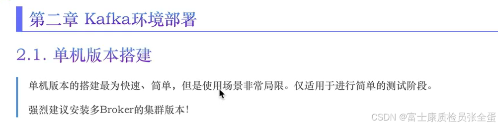 kafka的部署可以分为单机版本和集群版本,单机和集群的区别在于每一个kafka的实例称作为broker。所谓的单机版本意味着只有一个broker。只有一个节点,在这个节点上运行着broker,也就是kafka的实例。这是单机版本。