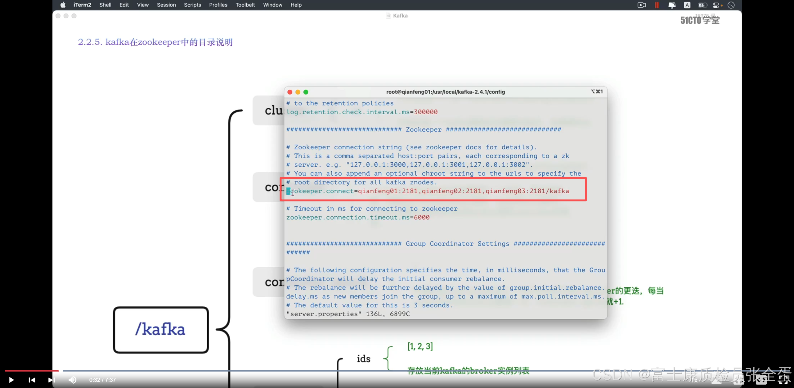 所以这就是斜线写的kafka的作用。这样表示kafka的所有的元数据信息是保存在了zk的根下的kafka节点下。