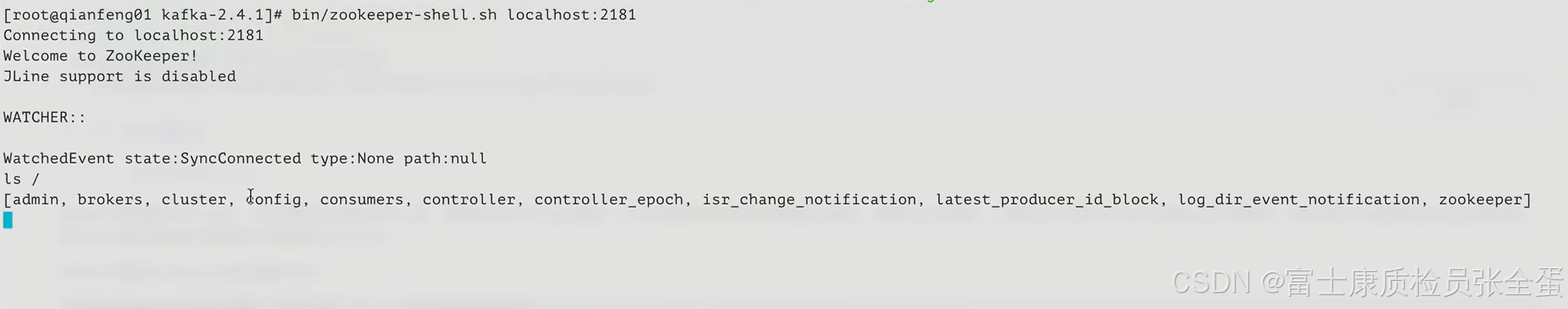 在kafka进程启动了之后,再去连接到zk,这个会去启动一个连接到zk的客户端,可以看到根目录下有这么多的节点生成了。这些节点存储的就是zk集群的元数据信息。