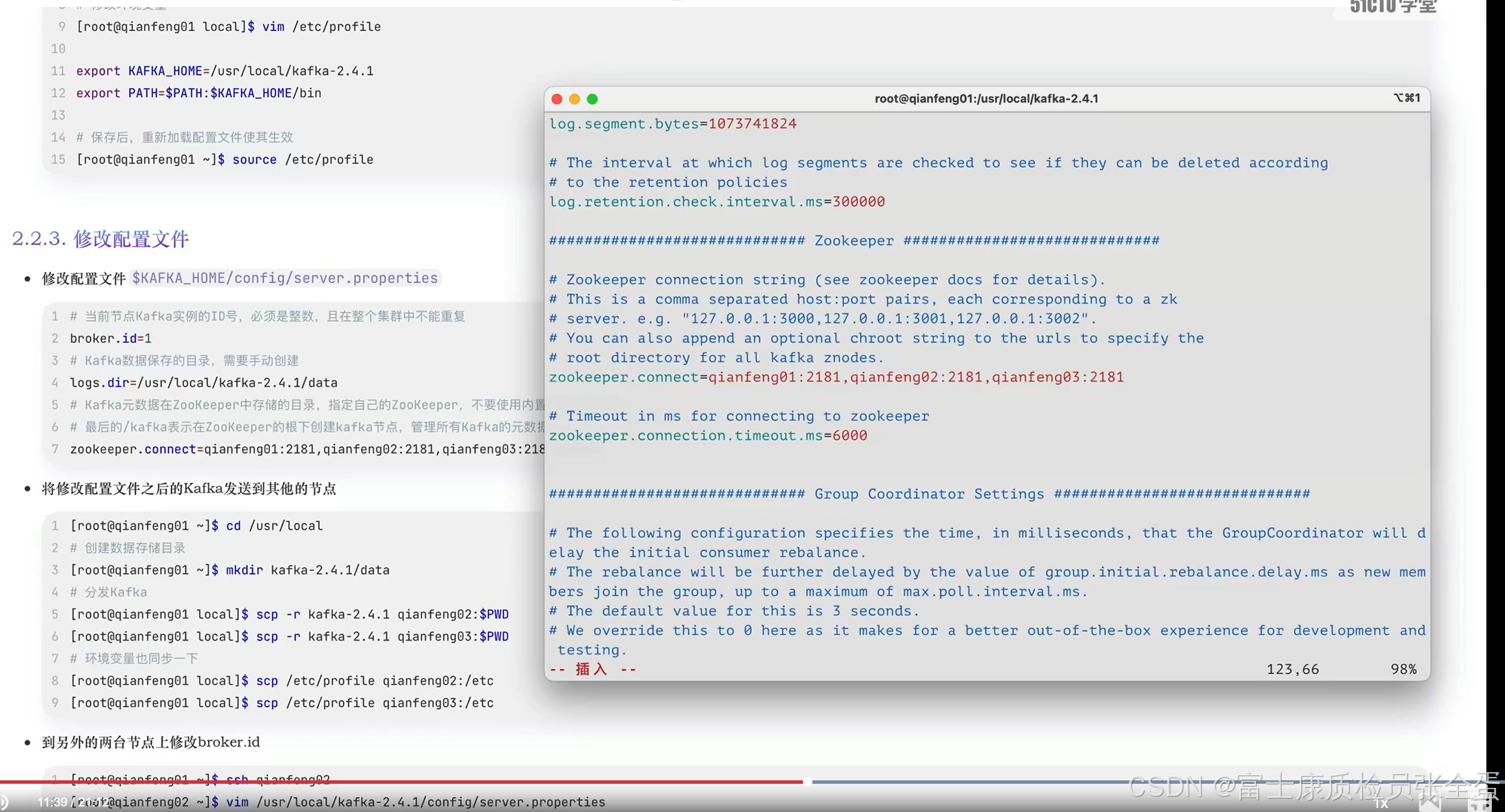 上面就是需要配置文件的地方。修改完之后分发给其他节点。其他节点修改broker.id,把它的值给改一下。这个值是整个集群中唯一的,不能重复的。改为2,3即可,剩余两台机器。