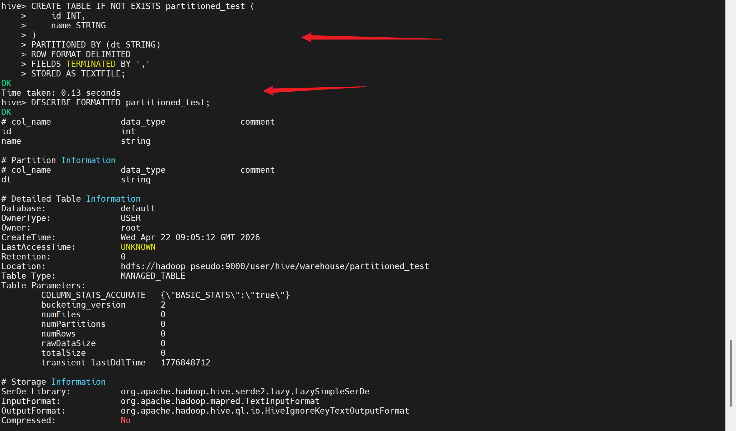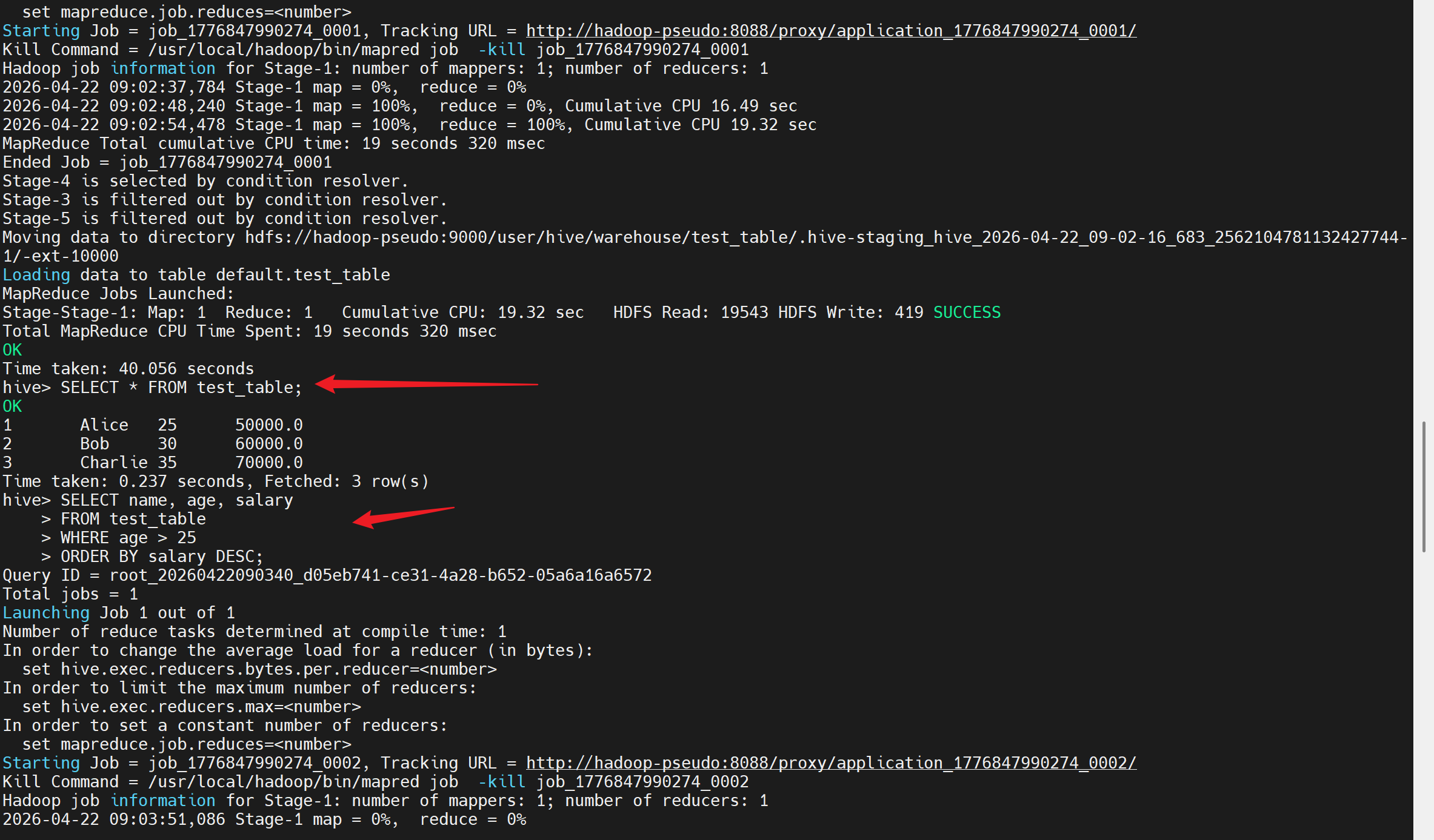 这些测试语句可以帮助验证 Hive 的基本功能是否正常工作,包括 DDL(数据定义语言)、DML(数据操作语言)和查询功能。