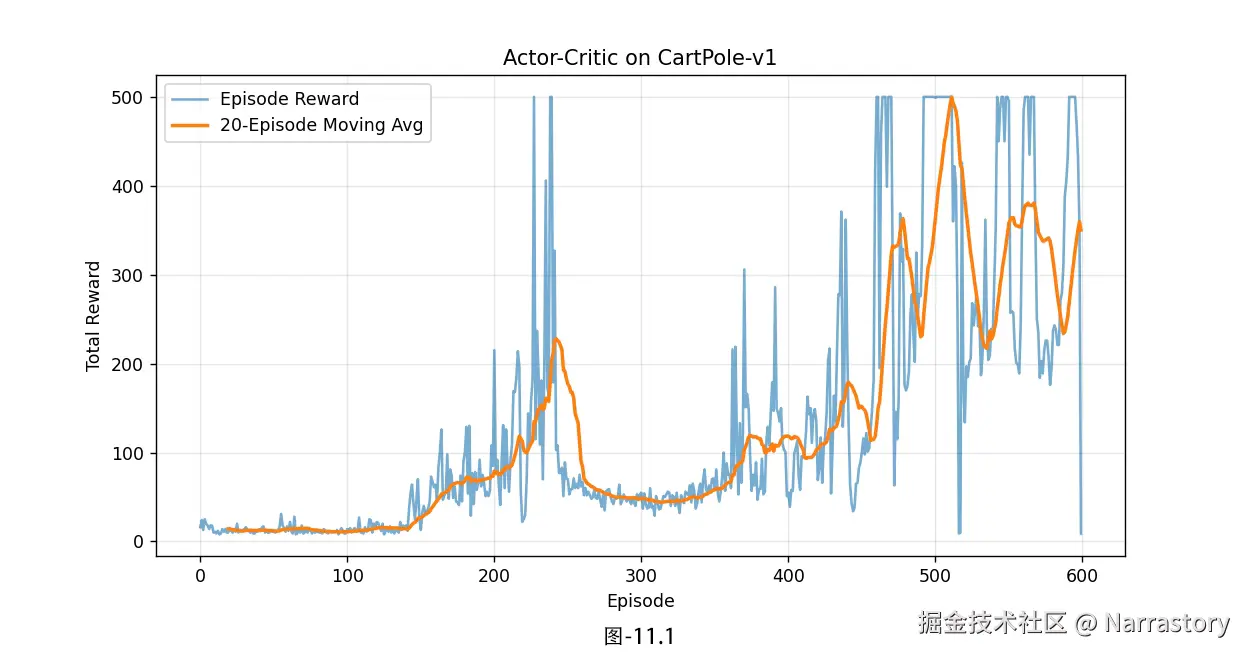运行结果如图11.1所示,从图中可以清晰观察到,奖励(reward)曲线呈现出明显的动荡特征:前期快速攀升至500左右的峰值后,随即骤降至50附近,之后又逐步回升,后续仍有反复波动,整体稳定性欠佳。其实这就是 AC 算法的典型训练特性------训练过程易波动、收敛速度偏慢,核心原因在于 Actor 与 Critic 两个网络存在"互相影响、互相更新"的耦合关系:Critic 的价值评估精度直接决定了 Actor 梯度更新的可靠性,而 Actor 策略的变化又会导致环境交互数据分布改变,进而影响 Critic 的训练效果,这种双向耦合很容易引发训练震荡。