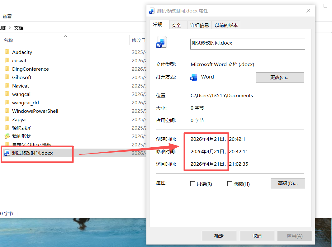 可以看到我这里创建了一个docx文件,它现在显示的创建时间、修改时间、访问时间都是2026年4月22日;