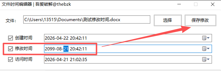 打开"文件时间编辑器",选择刚刚我们创建的这个"测试修改时间.docx"文件,先试试把时间改为前一天: