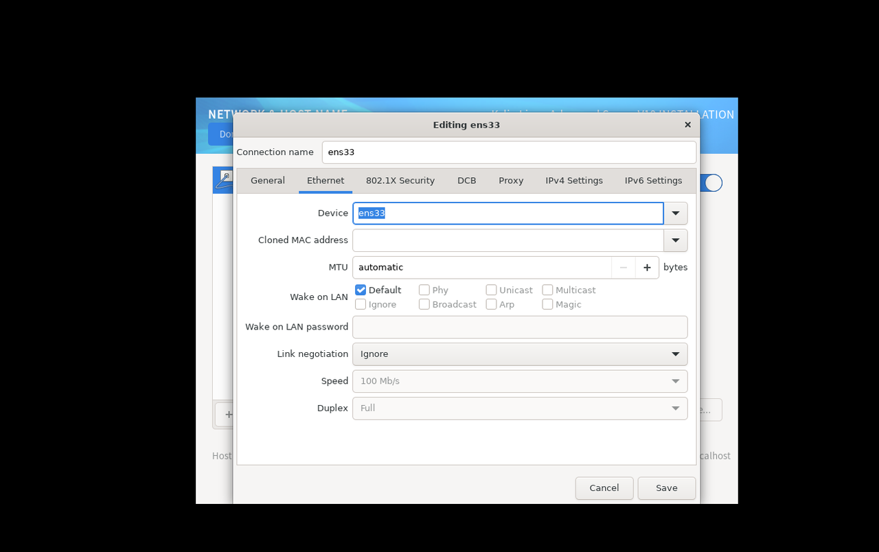 假设我们要将网卡 ens33 配置为静态 IP,参数如下: