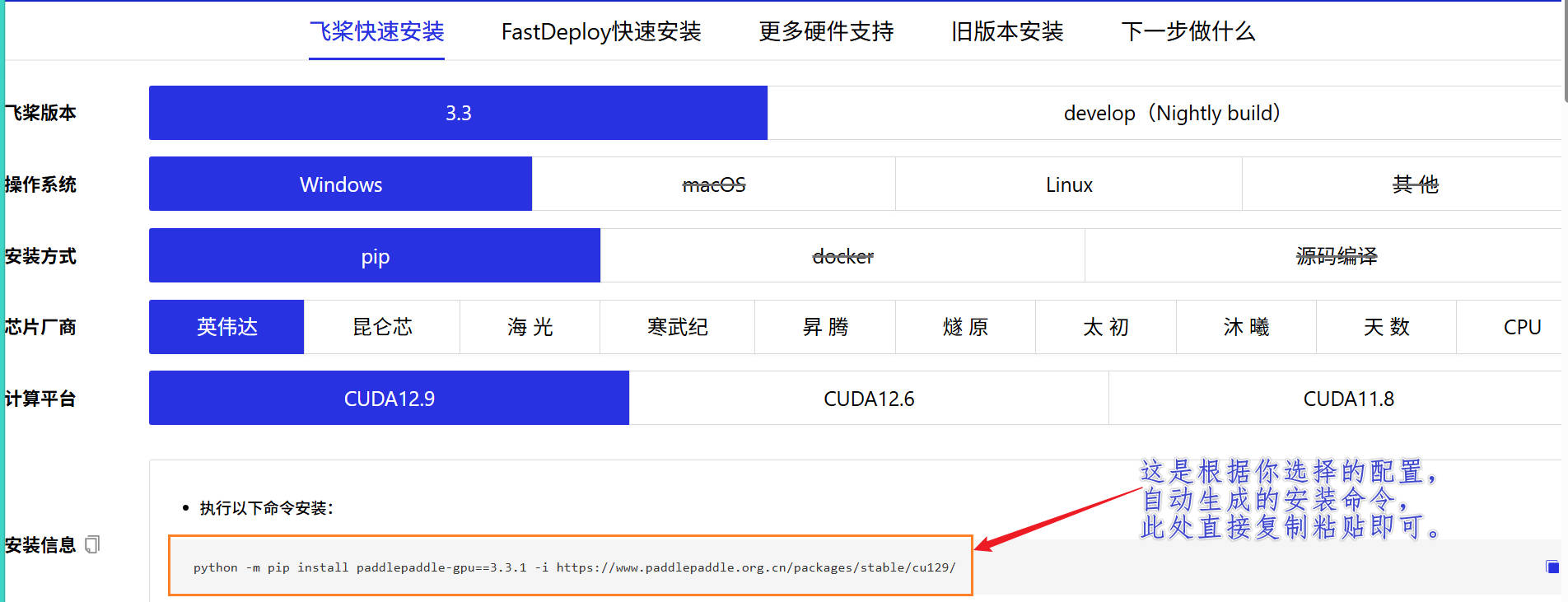 拿到CUDA版本后,就可以去PaddleOCR官网去获取下载命令 了。地址:++*https://www.paddlepaddle.org.cn/install/quick?docurl=/documentation/docs/zh/develop/install/pip/windows-pip.html*++