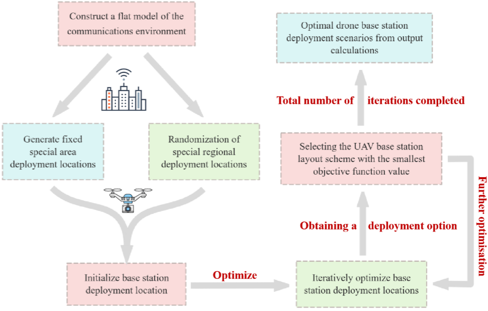 论文构建面向差异化服务需求的多无人机基站(UAV-BS)辅助通信三维部署模型,为在最小化无人机部署数量的同时保障信号连续性,该模型将目标环境划分为标准化网格,并基于服务质量要求严格界定关键任务区与标准服务区,从而建立空间覆盖优先级框架。模型综合考量信号强度阈值、覆盖半径及飞行高度等物理约束,量化空间覆盖率与均匀度双重评估指标。