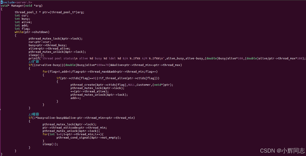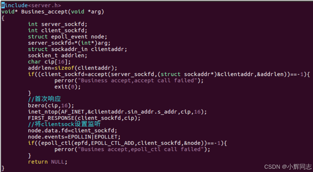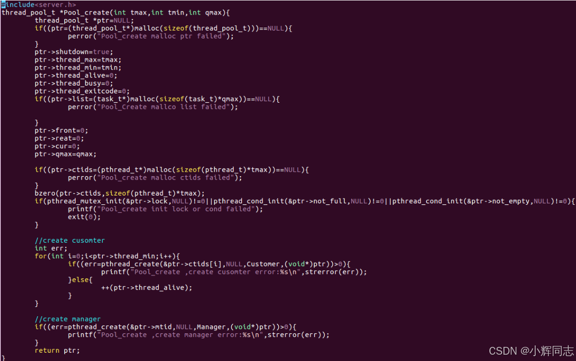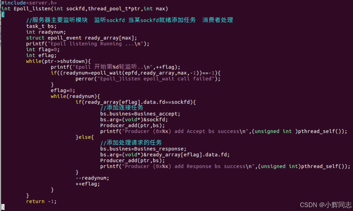 #include<server.h>:自定义头文件,包含线程池 (thread_pool_t)、任务 (task_t)、业务函数 (Busines_accept/Busines_response) 等自定义结构体和函数声明。