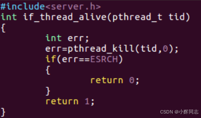 err == 0线程存活、err == EINVAL信号非法等)→ 返回1(存活)