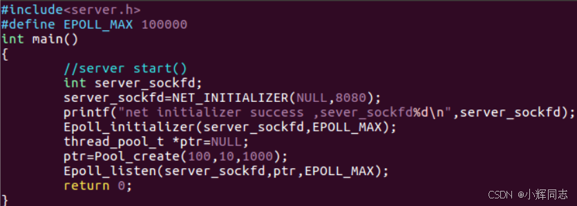 server.h:这是自定义的服务器头文件,封装了所有网络、Epoll、线程池相关的函数声明(NET_INITIALIZER/Epoll_initializer/Pool_create/Epoll_listen等),是工程中常见的模块化封装方式。