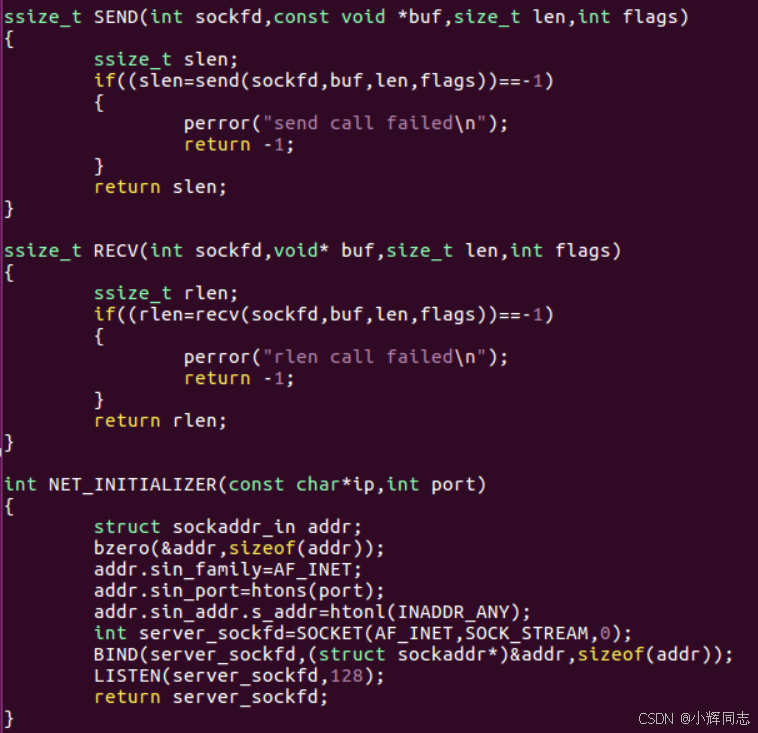 核心作用:完成 TCP 服务器的创建、绑定、监听,返回监听套接字server_sockfd。