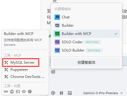 配置成功并重启 Trae 后,选择Builder with MCP 就可以像与真人对话一样,让 AI 助手帮你操作数据库了。