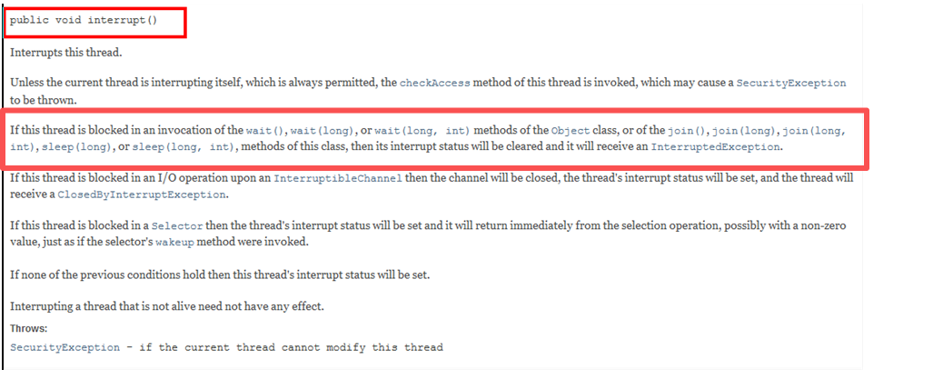 若要中断一个线程,你需要手动调用该线程的interrupt方法,该方法也仅仅是将线程对象的中断标识设成true;