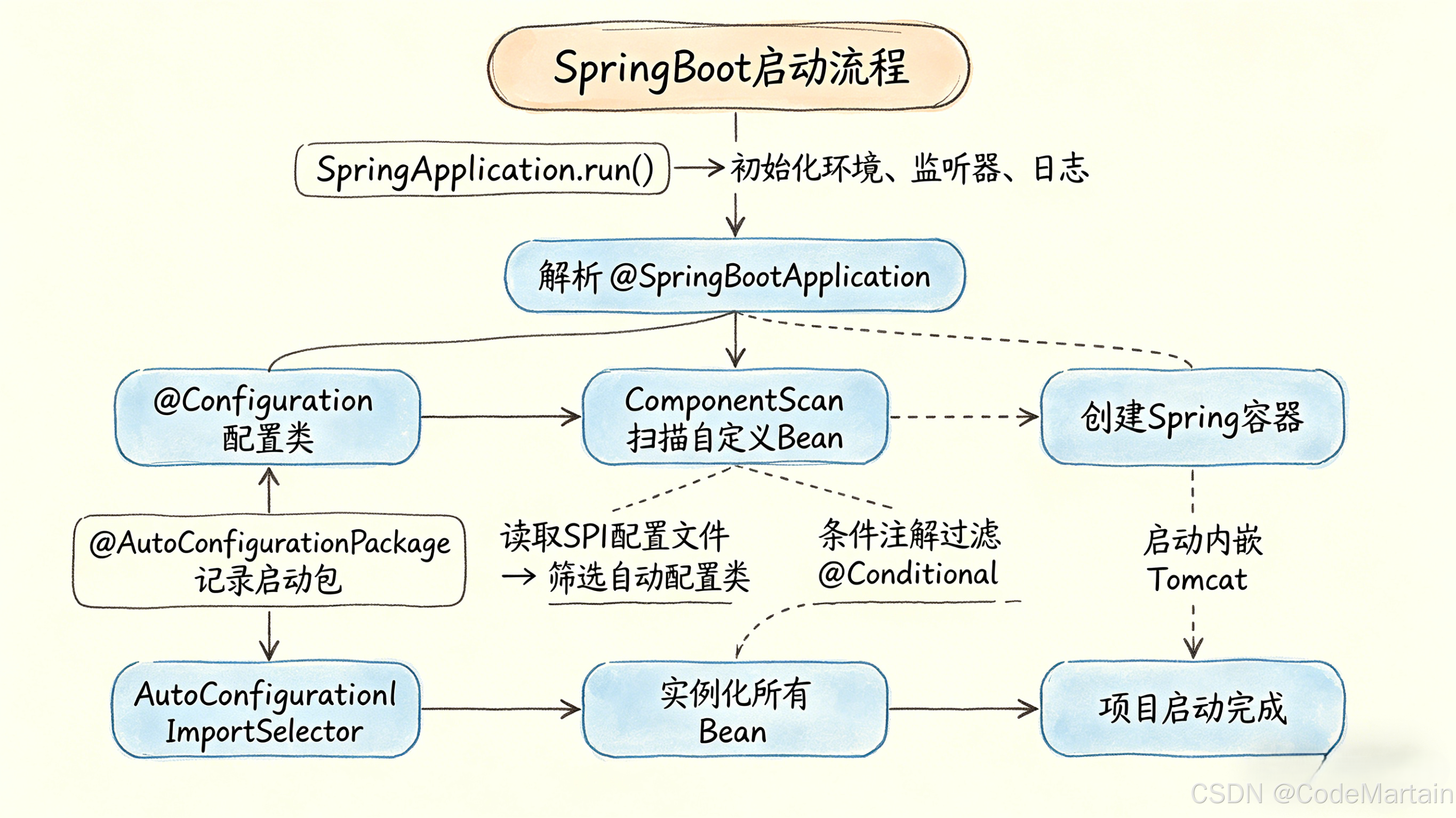 - Spring 加载这些配置类 → 自动创建DataSource、Tomcat、Redis...